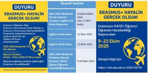 Üniversitemiz Uluslararası İlişkiler Uygulama ve Araştırma Merkezi tarafından 08 Ekim 2025 Çarşamba günü saat 13.30’da Fakültemiz 102 nolu Konferans Salonunda öğrencilerinize Erasmus+ Öğrenci Öğrenim Hareketliliği ve Erasmus KA131 (Avrupa) Öğrenci Staj Hareketlilikleri hakkında bilgilendirme toplantısı yapılacaktır.