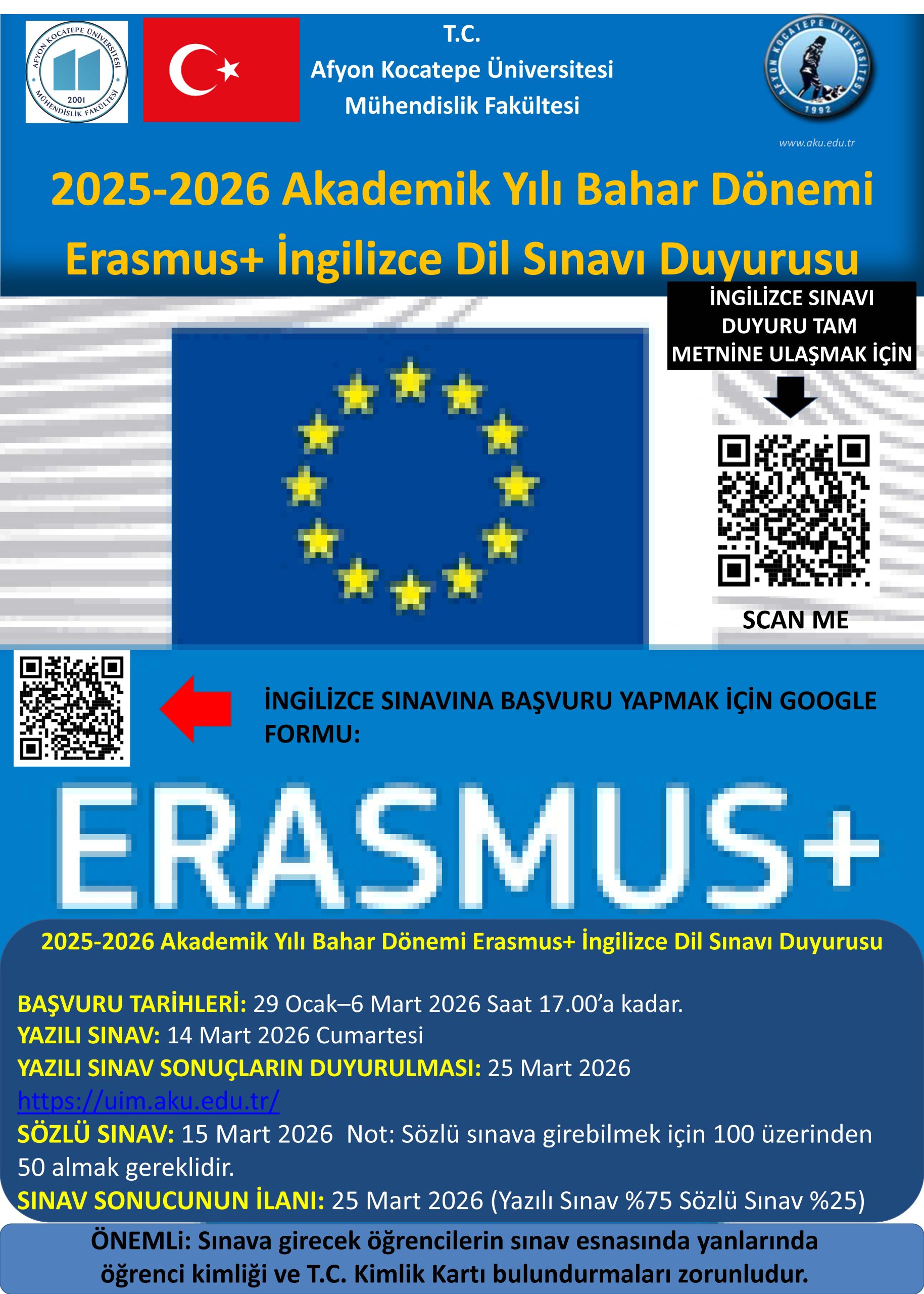 2025-2026 Akademik Yılı Bahar Dönemi Erasmus+ İngilizce Dil Sınavı Duyurusu